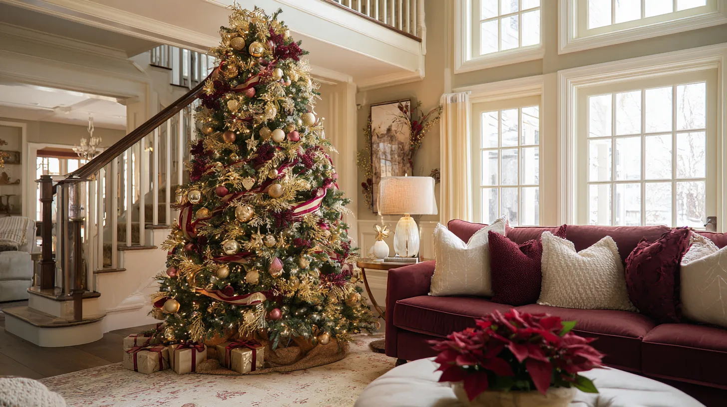 Rich burgundy ribbons create sophisticated depth and movement that elevates your Christmas tree from simple decoration to elegant room centerpiece. This deeper shade of red adds mature sophistication while maintaining traditional Christmas warmth, making your living space feel more refined and intentionally designed. The flowing ribbon texture creates visual softness that balances the rigid structure of tree branches, while the deep color coordinates beautifully with existing furniture and decor. This approach provides excellent value since quality ribbons can be reused for years, and the timeless color choice ensures your tree will look current and stylish regardless of changing trends in holiday decorating.