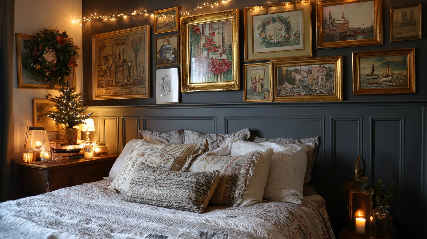 Design a bedroom retreat that tells your unique holiday story through carefully arranged vintage-inspired artwork. This personalized approach creates intimate warmth while showcasing your individual style and collecting interests. The mismatched frame treatment adds charming character that feels collected over time rather than purchased all at once. The metallic elements catch and reflect light beautifully, creating subtle glamour in your private space. This concept works wonderfully for creating conversation pieces that guests will remember while maintaining the cozy comfort essential for restful bedroom environments.