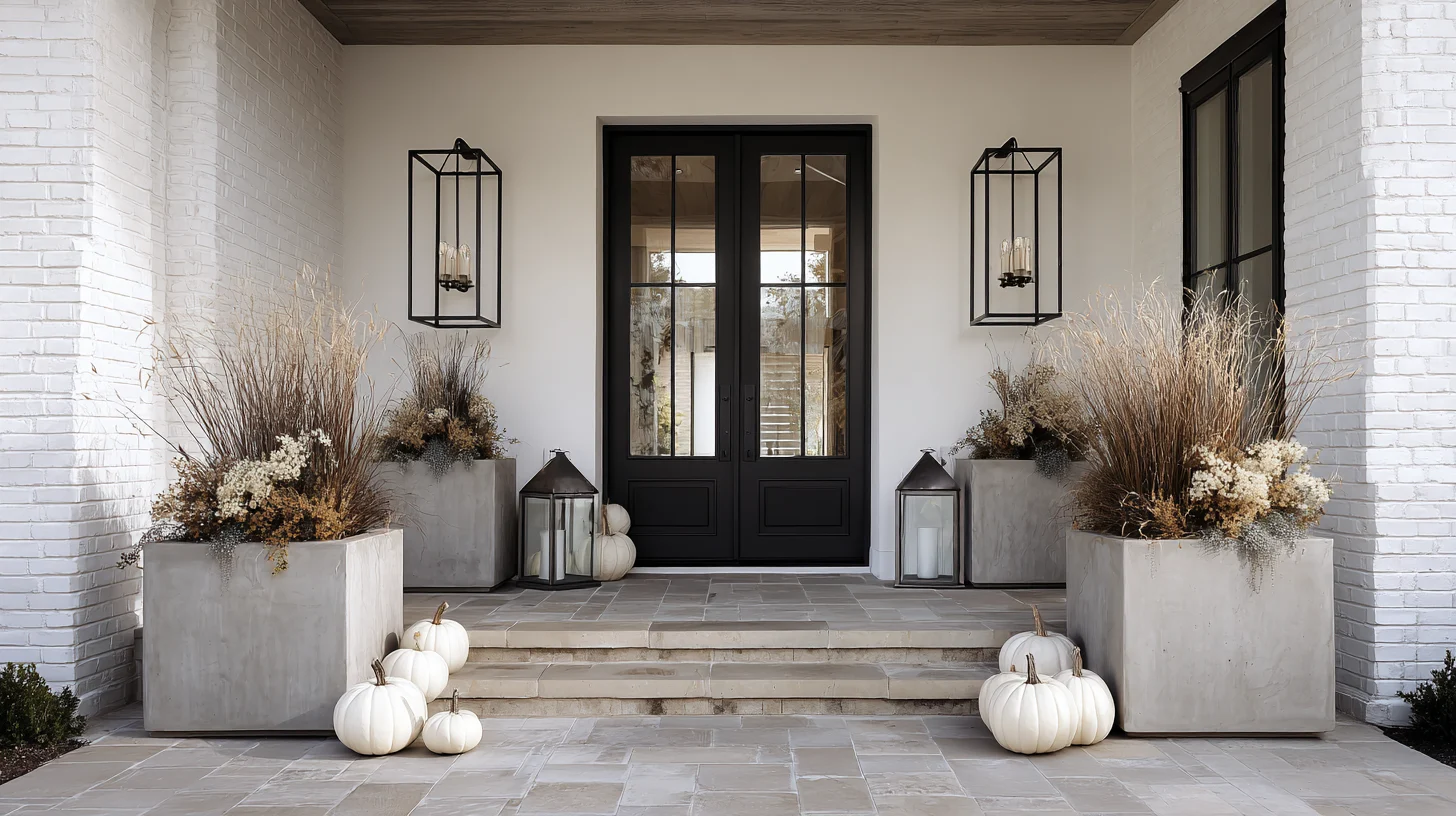 Clean white pumpkin displays create refined autumn atmosphere while maintaining the minimalist aesthetic that makes modern homes feel serene and uncluttered. This sophisticated approach works exceptionally well because it provides seasonal recognition without overwhelming your home’s architectural features or competing with existing color schemes. The neutral palette allows your porch’s natural beauty to remain prominent while adding just enough autumn spirit to feel appropriately seasonal. This styling choice creates timeless appeal that photographs beautifully and ensures your entrance feels welcoming rather than overwhelming, making guests feel comfortable approaching your home.