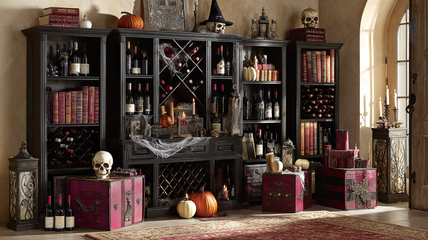 Enhance wine storage and tasting experiences with elegant Halloween bookcase styling that complements fine wine culture while adding seasonal sophistication. This refined approach creates an atmospheric environment perfect for wine tastings and intimate gatherings with fellow enthusiasts. The climate-controlled elements ensure both wine and decor maintain optimal conditions while the rich color palette enhances the luxury feel of wine storage areas. Your wine cellar becomes a destination space where guests want to linger and explore both your wine collection and seasonal literary selections. The sophisticated atmosphere elevates casual wine tastings into memorable seasonal experiences.